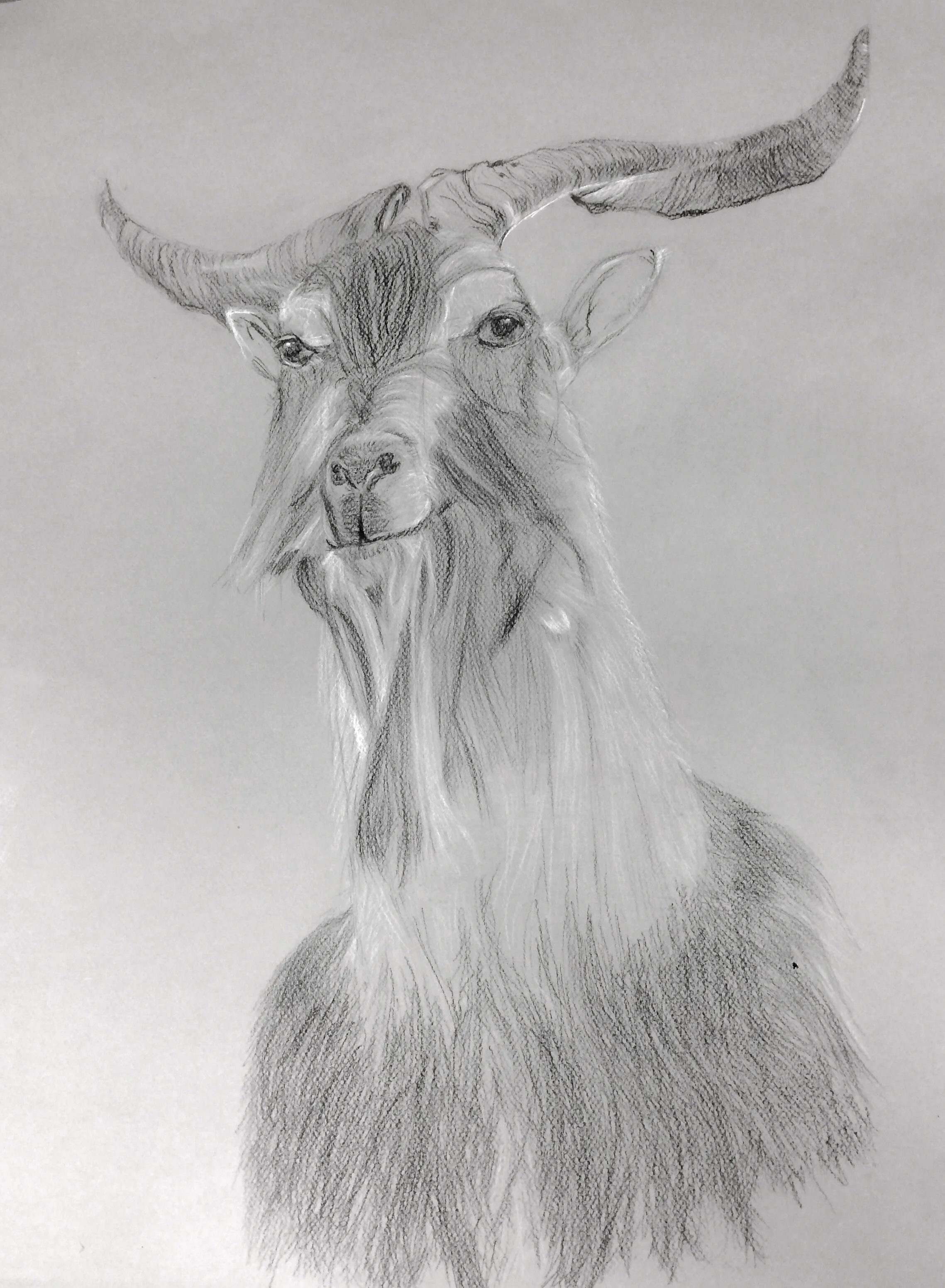 After multiple painstaking sessions of sitting in the same chair for several hours and staring at the same goat in a taxidermy exhibit, I’m proud to present…Tom Brady. (Haha!) This final version is rendered on gray paper with black and white charcoal pencils.