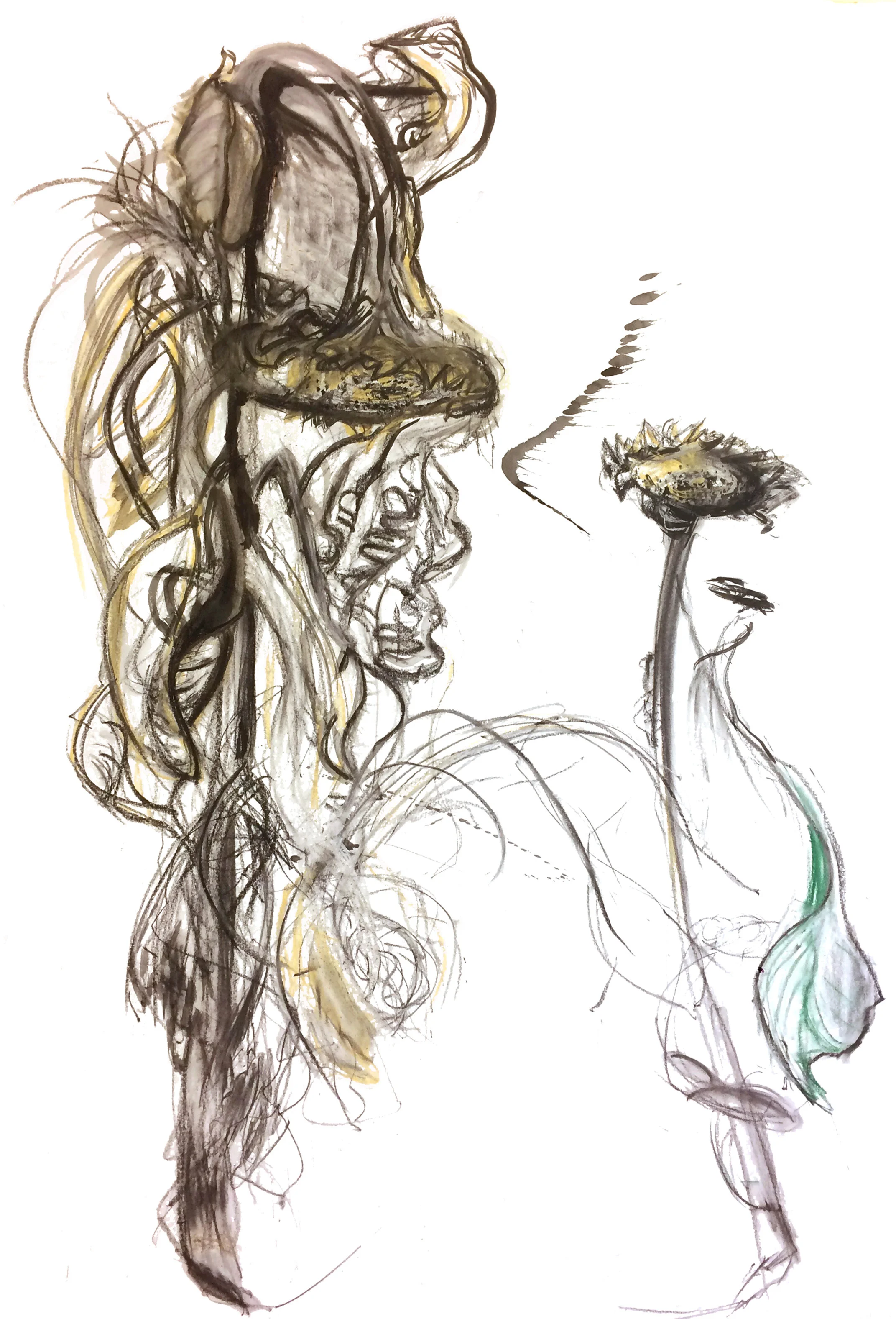 The physical version of this piece is five feet tall, and it is based on an actual pair of sunflowers that size. This drawing is comprised of several layers of mixed media including charcoal, acrylic and watercolor paint, and pen and ink.