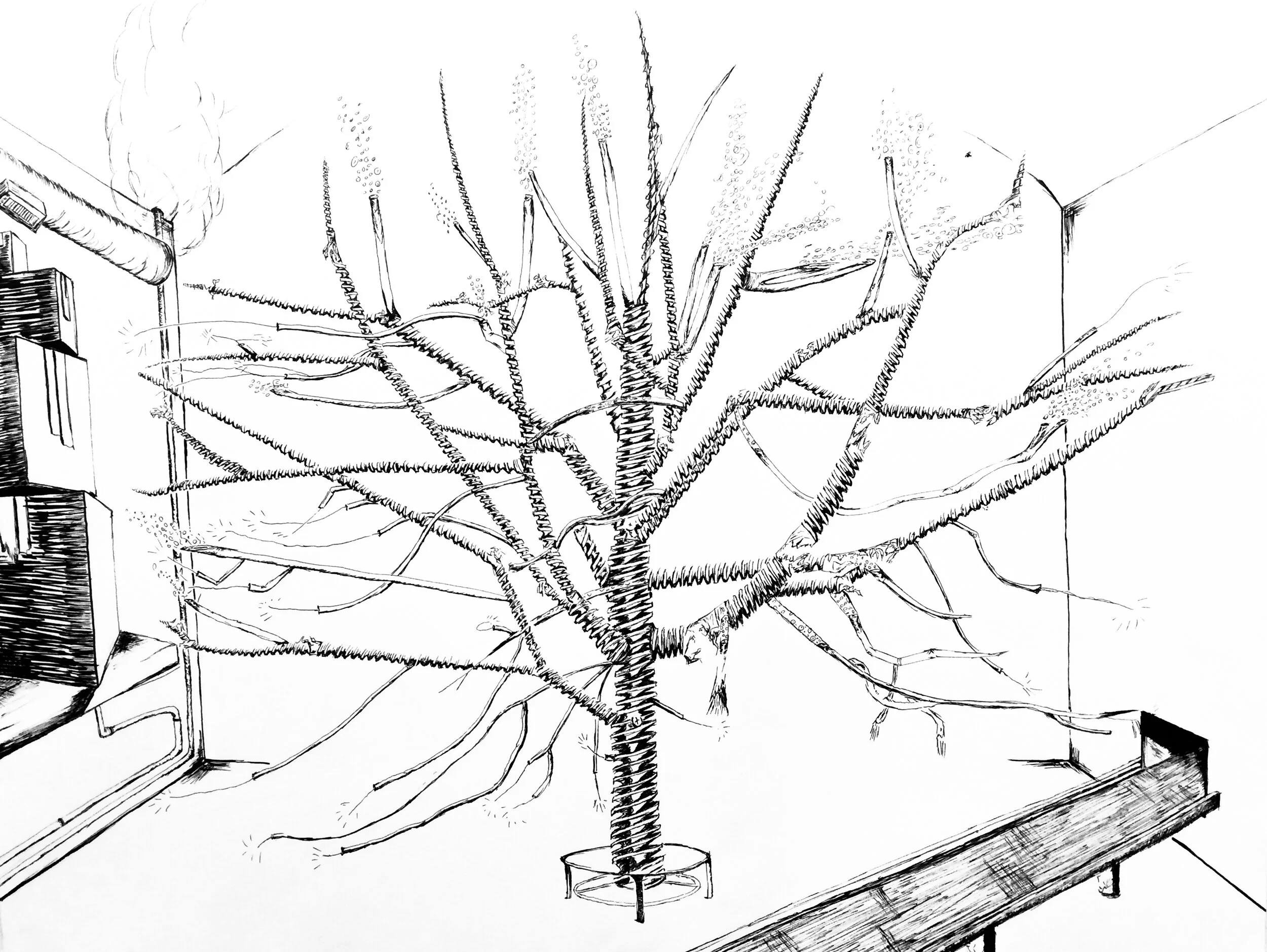 What if nature looked like a machine? It’d look like this: a tree with massive screws and drill bits for branches, inside a shell of a factory. I first drew the tree in proportion to a real tree, and then carefully copied it line for line onto a larger piece of paper. The screw and machine effect was added later with a thin brush pen.